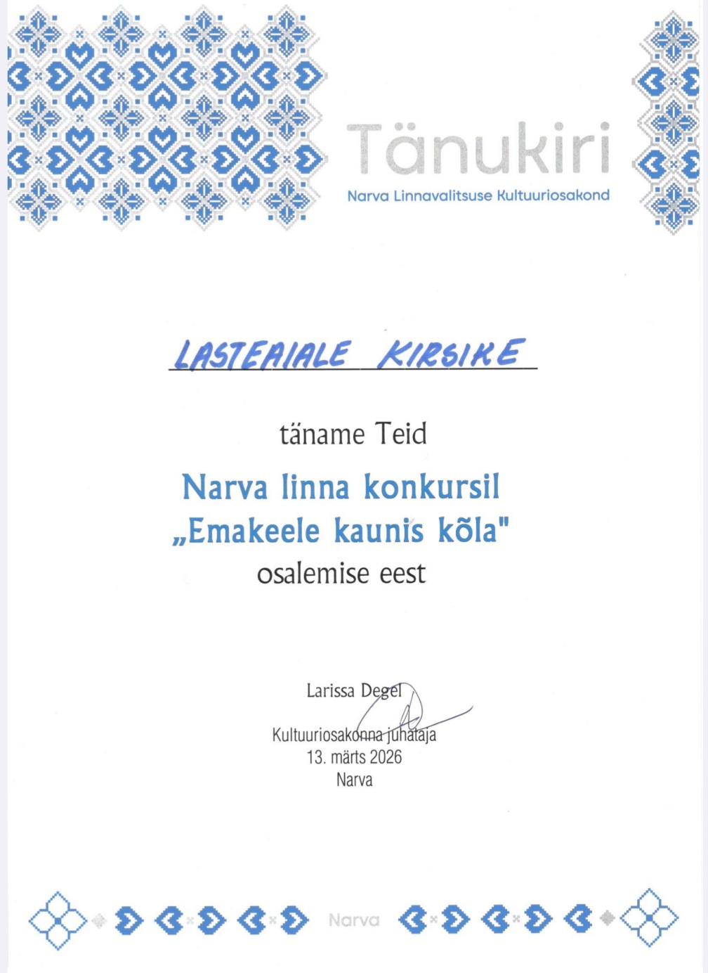 3 октября 2025 года состоялось торжественное мероприятие, посвящённое городскому конкурсу «Учитель года – 2025». В мероприятии приняли участие руководители, педагоги, специалисты, чья самоотверженность и ежедневный труд внесли значительный вклад в развитие образования в Нарве. Семья детского сада Kirsike гордится своими признанными коллегами – музыкальным руководителем детского сада Натальей Сазоновой, победившей в номинации «Воспитатель года в детском саду».